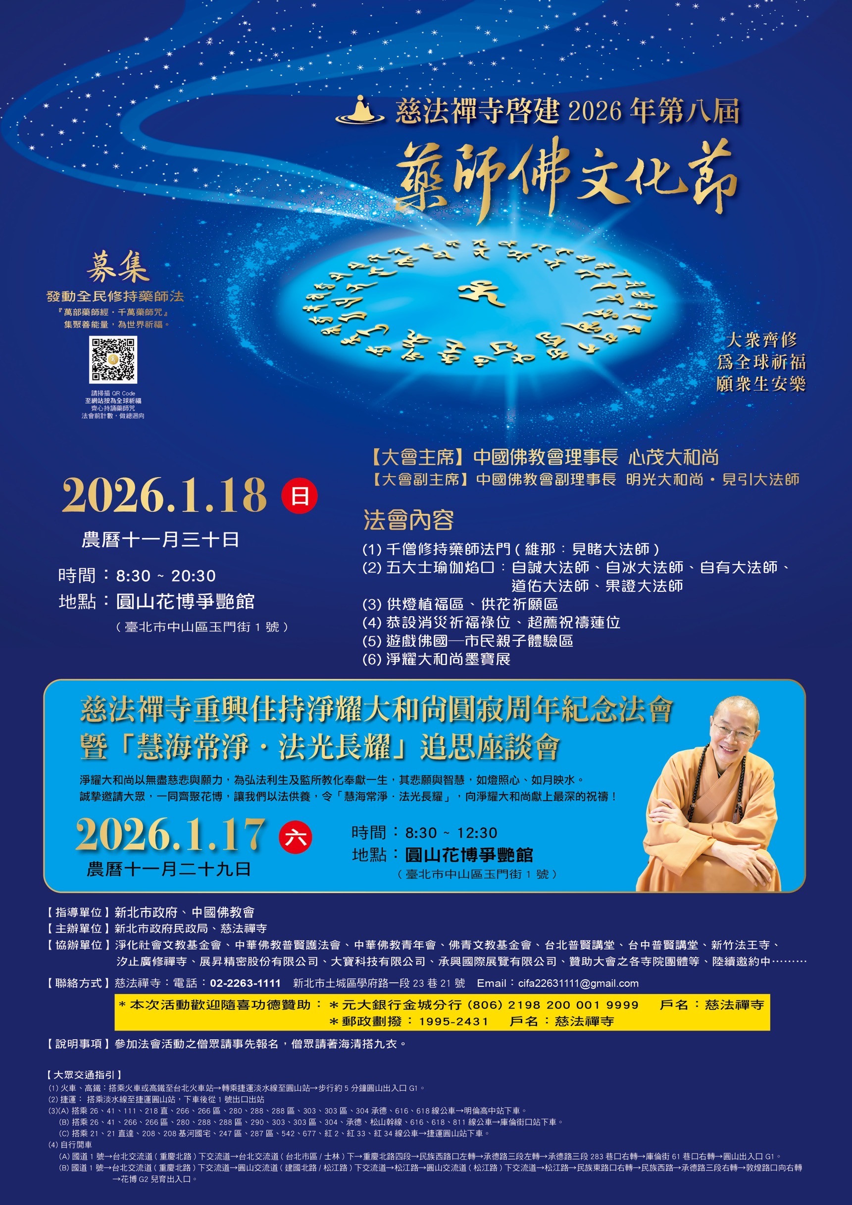 第八屆藥師佛文化節由新北市政府、中國佛教會擔任指導單位,市府民政局與慈法禪寺共同主辦,誠摯邀請社會大眾於2026118日攜家帶眷共襄盛舉,透過參與藥師佛文化節讓孩子獲得善能量,在心中播種善念與祝福,藉此培養自利利他之美德,共同為台灣祈願、天地祥和、國運昌隆、人民安樂以及一切有形無形眾生得到安穩與撫慰,發心同行共修善願。