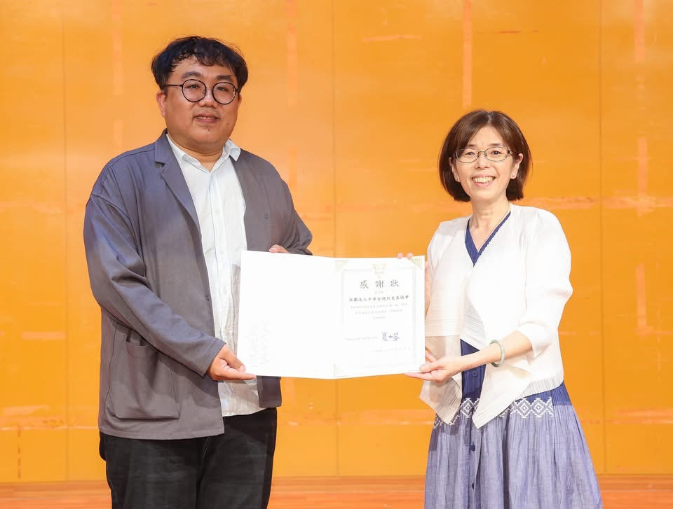 除了全系師生共聚一堂,更要認識並感謝平日默默支持的貴人。安得烈慈善協會自去年開始,在前主任陶聖屏的努力下,與新聞系簽定備忘錄,提供經濟不利學生獎助學金,讓同學可以安心就學。安得烈慈善協會資源發展處蔣慶章代表接受新聞學系致贈感謝狀。蔣處長鼓勵同學,運用報導的專業,讓公共議題被看見,公共利益被落實。