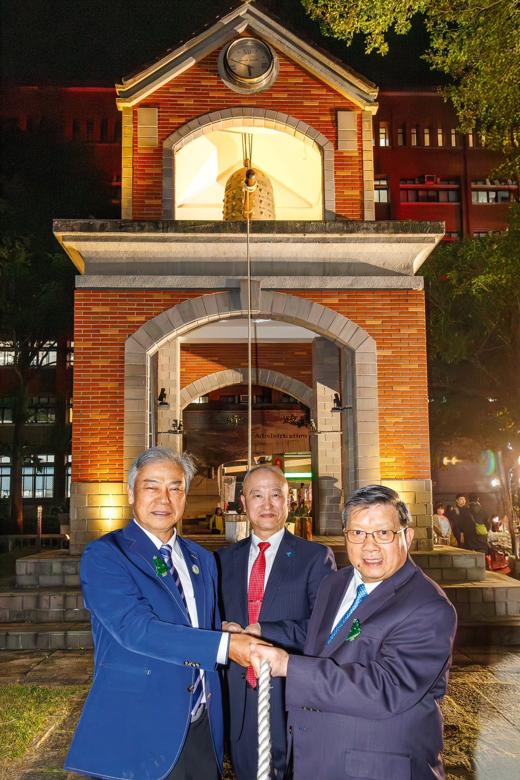 陳慶和校長、粘舜權理事長與葉寅夫董事長一同敲響象徵祝福與希望的和平鐘
