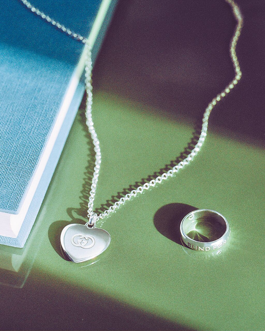 GUCCI心形銀項鍊,1萬4900元;刻有Blind for love字樣銀戒指,1萬4000元。(GUCCI提供)