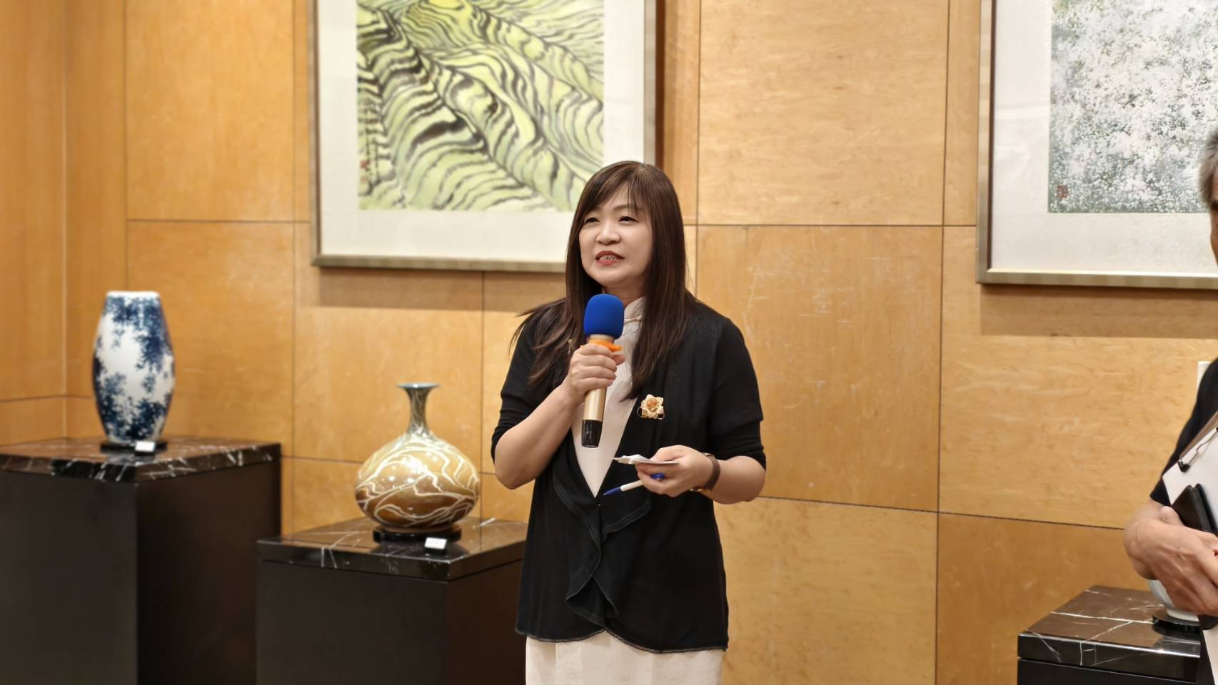 中華中道領導文化總會理事長、中央投資公司董事長陳樹致詞表示,今日參展的九位藝術家,無論在水墨還是立體陶瓷的創作上,都展現了深厚功力與高度造詣。他們以書畫為載體,傾注自信與熱情,融會中華文化的博大精深與精緻優雅,在道法自然中體悟天人合一,使作品兼具藝術美感與文化深度。