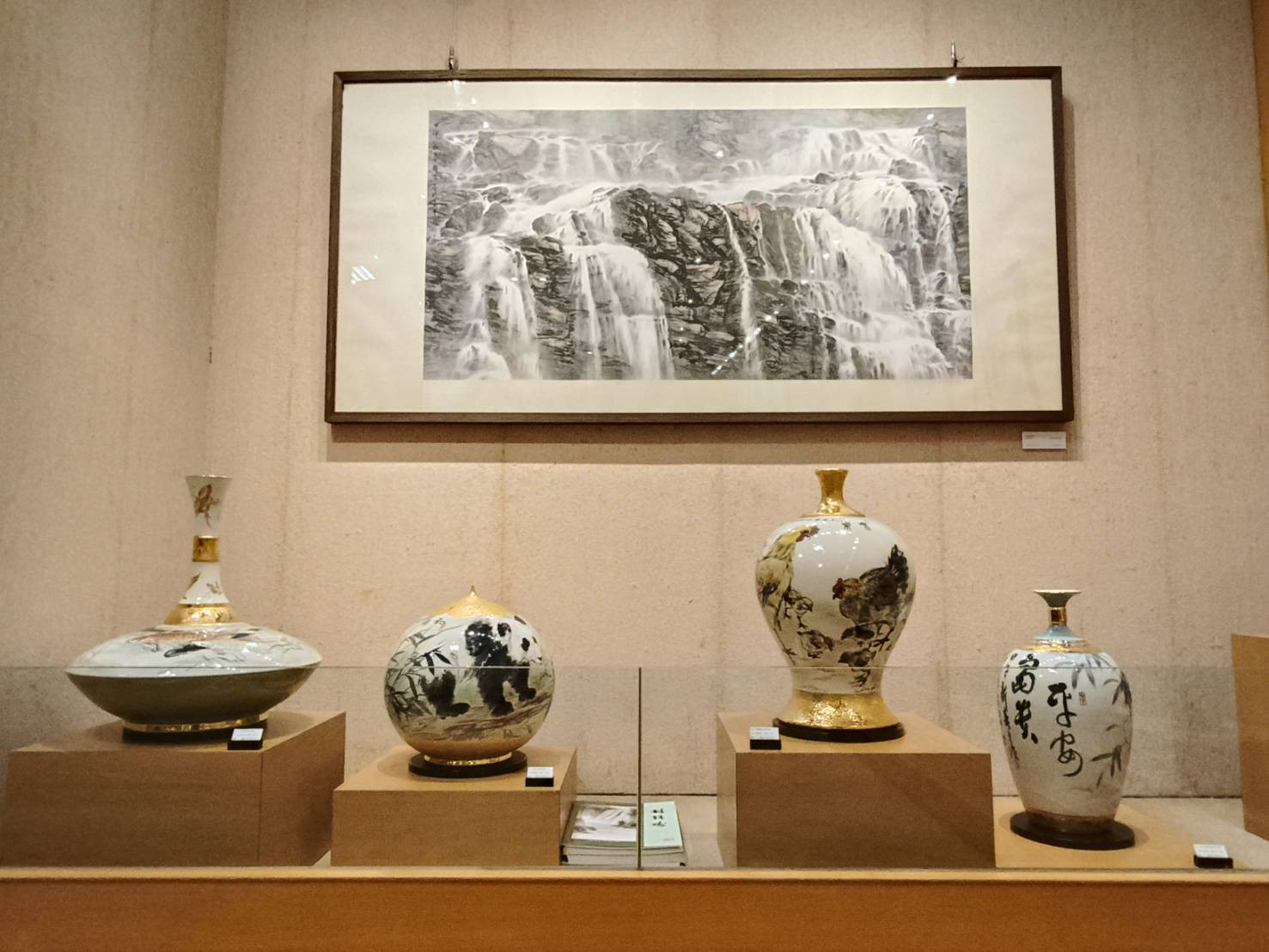 本次展覽其中彩瓷作品表現分為兩種方向,以林錦濤老師為代表的,講究在高溫燒製後依然保有水墨的層次與韻味,開創彩瓷藝術的新境界。他以深厚的彩墨功底,將傳統紙本彩墨的筆韻與神采,精準移植至瓷胚彩繪之中,林錦濤的作品題材寓意深遠,如《如意》、《合家歡》、《山高水長》等,不僅造型典雅、色彩細膩,更蘊含吉祥與人生哲理,展現其兼融技藝精湛與文化厚度的非凡成就。另一類則藉由不同釉料在燒製過程中的交融變化,創造出獨特而難以預測的視覺效果。