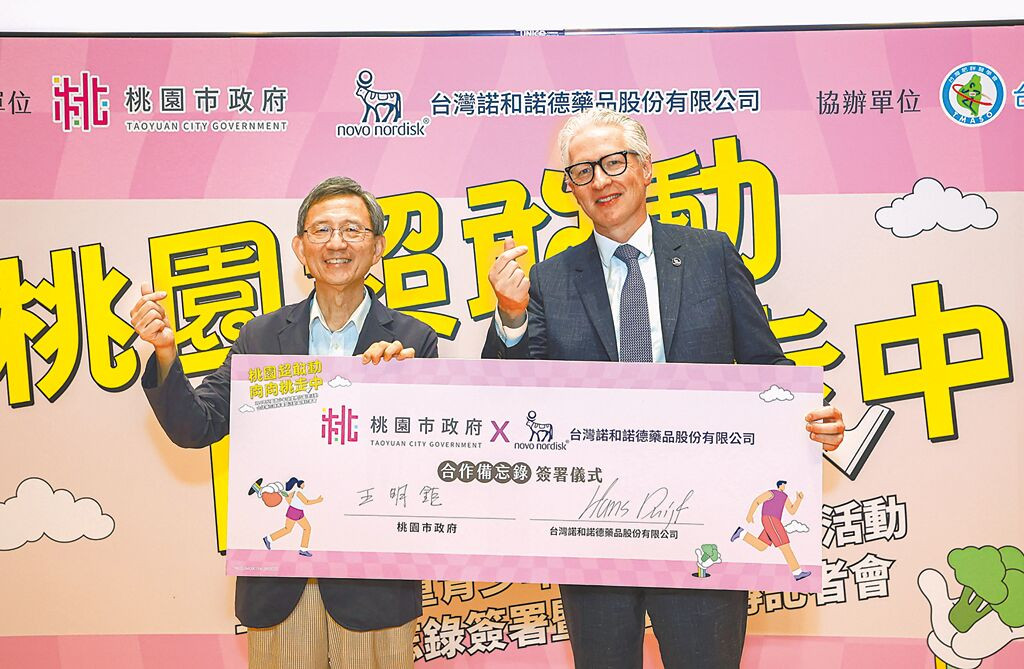 學童體重管理受到關注,桃園市副市長王明鉅12日和台灣諾和諾德藥品公司總經理杜翰思簽署「桃園超敢動-肉肉桃走中」兒童青少年健康體位管理活動合作備忘錄。王明鉅說,桃園青少年肥胖率在全國「名列前茅」,希望從小注意,降低肥胖問題。
