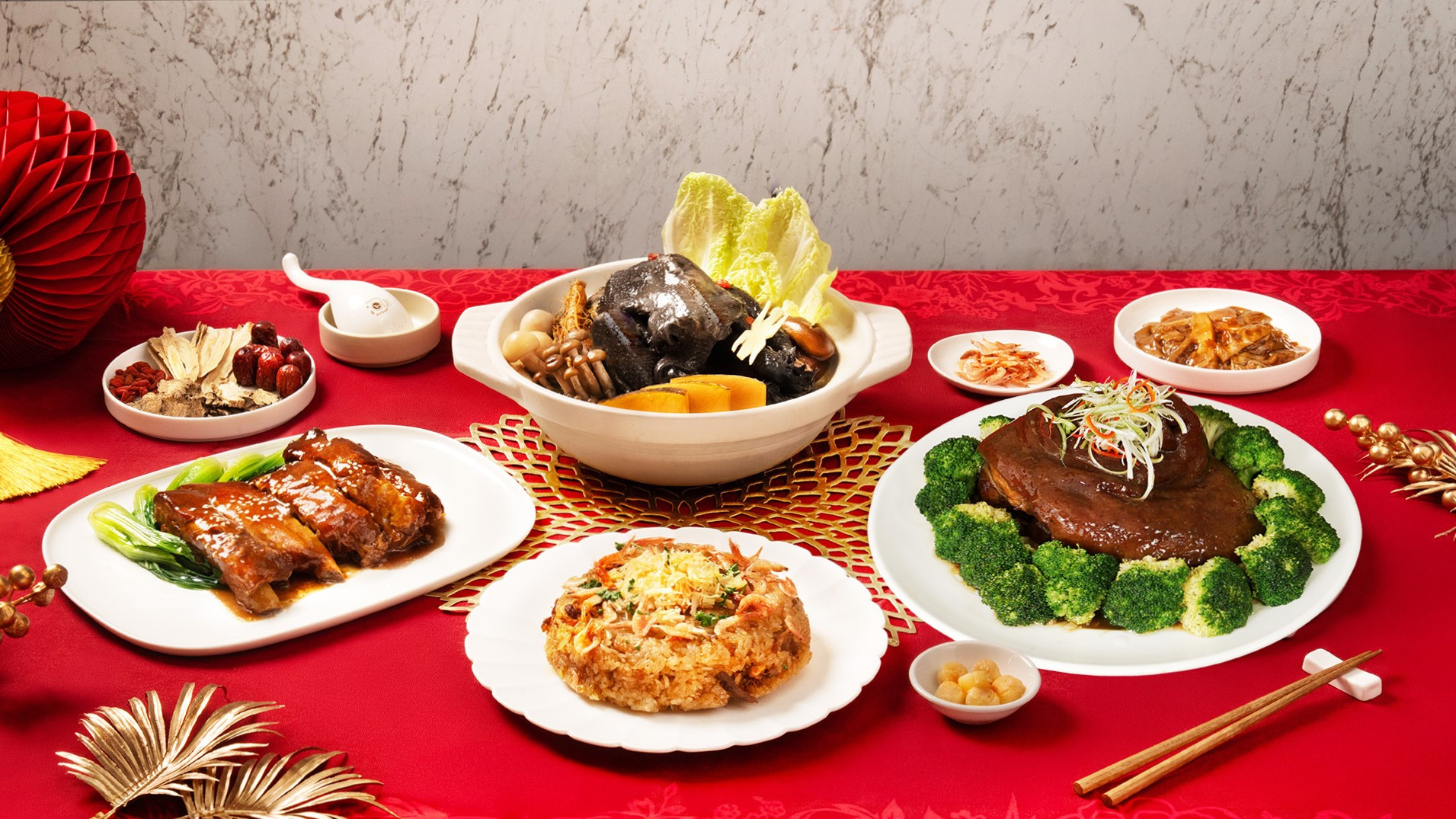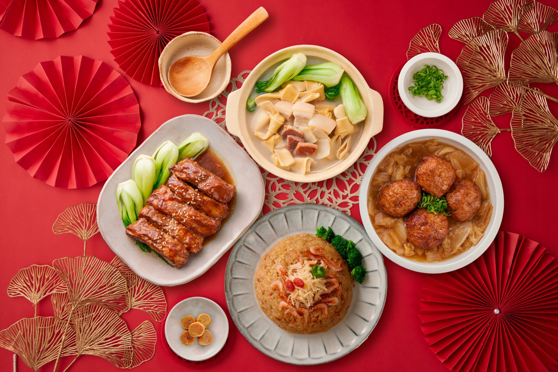 由李璐老師監製的功夫菜系列,重現經典江南滋味醬香入骨的「無錫醬燒子排」、香氣層疊的「黃金干貝櫻花蝦米糕」、手打軟嫩的「江蘇獅子頭」及口感濃郁又不失清雅的「上海醃篤鮮」;陳育仁主廚則以飯店級品質監製「金燒筍絲蹄膀」與「慢煨烏骨雞湯」兩道經典年菜。六道料理兼具風味、份量與儀式感,輕鬆端出團圓家宴的豐盛氣氛。