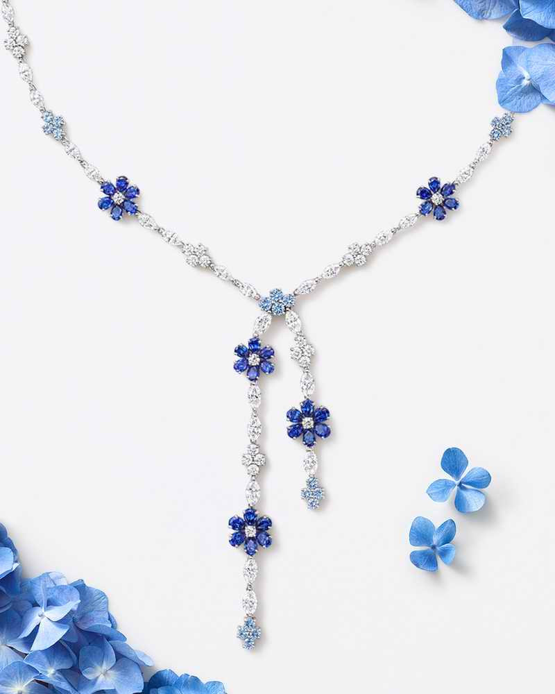 勿忘我Forget-Me-Not系列 Lariat藍寶石鑽石項鍊 ,以78顆水滴型切工與圓形明亮式切工藍寶石,交織99顆馬眼型切工與圓形明亮式切工鑽石,勾勒出柔美流麗的花卉造型與優雅線條。色澤明豔而氣場鮮明,無論出席精緻晚宴或作為七夕情人節的獻禮,都能完美演繹動人情意,在閃耀光影中為愛定格絕美瞬間。