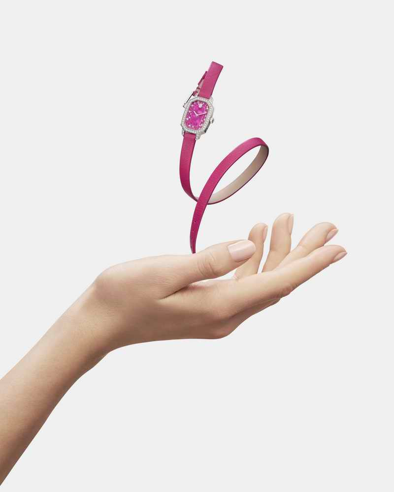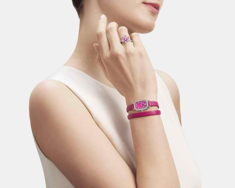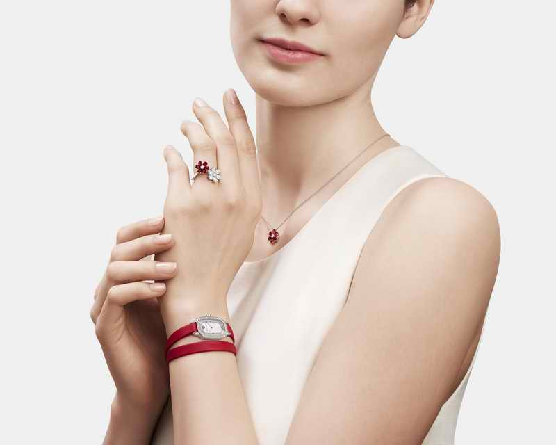 本次精選三款印記 Emerald 系列雙圈緞面錶帶款式,為七夕造型注入甜美光芒:紅色款風格華麗搶眼,以白色珍珠母貝錶盤點綴四顆絕美紅寶石,象徵愛意的熾熱濃烈;粉色款柔美溫婉,散發細膩少女氣息,與勿忘我 Forget-Me-Not 系列粉紅藍寶石戒指相互輝映,是戀人間悄然契合的詩意象徵;而夢幻的糖果粉色款則以虹彩粉色珍珠母貝錶盤,搭配大小不一的蛋面珍珠母貝與 20 顆圓鑽,幻化為錶盤内圈的閃耀氣泡,錶盤上 12 點鐘位置飾以祖母綠型品牌標誌,如愛情裡怦然心動的悸動時刻。