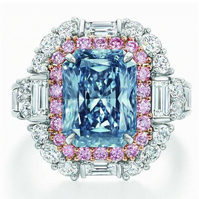 海瑞溫斯頓Hope頂級珠寶系列 藍鑽和粉鑽戒指以豔彩雷德恩形切工藍鑽為主石,淬鍊出令人屏息的深邃藍色光芒。為烘托主石之美,周圍以柔美圓形明亮式切工粉鑽和璀璨的長錐形及圓形明亮式切工鑽石層層環繞,綻放出宛如光暈擴散的璀璨效果,營造華美層次感。這款獨一無二的戒指同時匯聚了藍鑽與粉鑽兩種最為稀有的彩鑽,彰顯品牌對世界頂尖寶石無可比擬的鑑賞力。