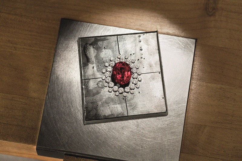 海瑞溫斯頓橢圓形切工紅寶石與鑽石戒指以一顆濃郁紫紅色的紅寶石為主石,重約 20.25 克拉,展現出彩寶極致的光韻與濃豔色彩。主石周圍以圓形明亮式切工鑽石交錯環繞,形成層次豐富的光影,優雅襯托紅寶石的深邃與華美。這件珠寶充分演繹海瑞溫斯頓對珍稀彩寶與鑲嵌工藝的極緻追求,以鮮明色彩與璀璨鑽石交織,綻放出無與倫比的高貴氣度與奢華典範。