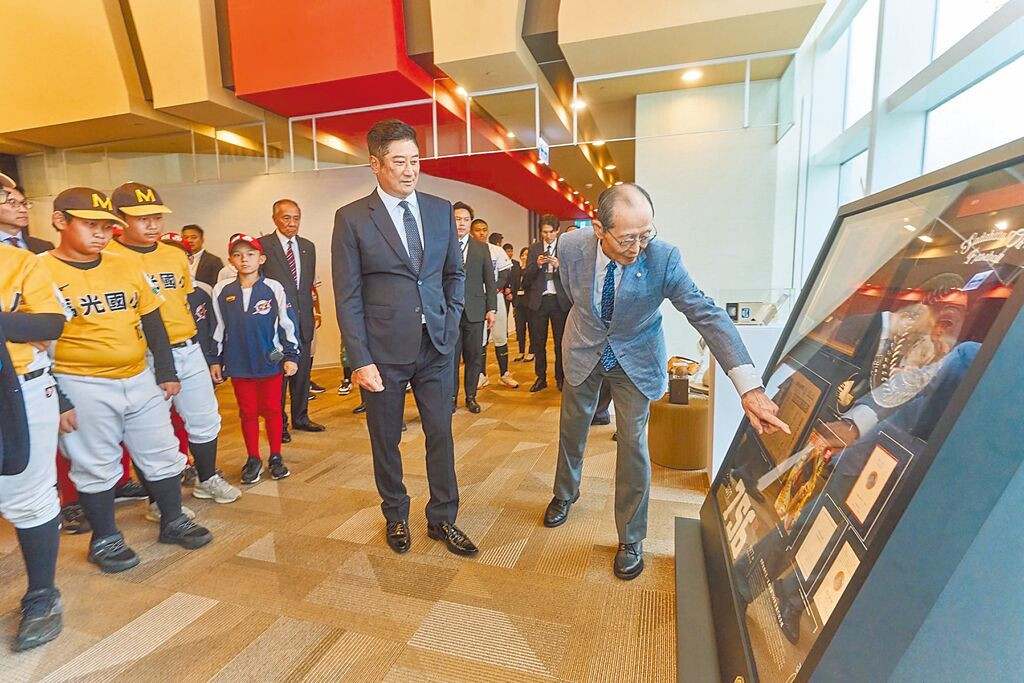 中華棒協理事長辜仲諒(前右二)為「世界全壘打王」王貞治(前右一)導覽收藏展品。(中華棒協提供)