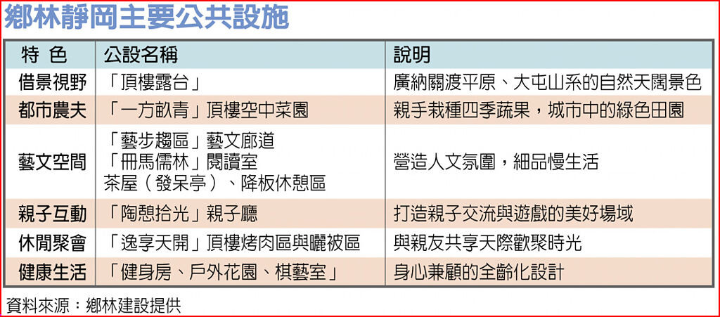 在公設規劃上,「鄉林靜岡」延續鄉林建設「不只賣一個房子,而是提供住戶全新的生活體驗」的理念,設計多元且極具美學巧思的空間。挑高大廳「千里之堂」展現迎賓大器;「陶憩拾光」親子廳打造親子互動場域;「藝步趨區」藝文廊道與「冊馬儒林」閱讀室,為社區注入濃厚人文氣息;「茗響心境」茶室與「陶冶青談」降板休憩茶屋,則成為沉澱心境、悠閒交流的最佳去處。