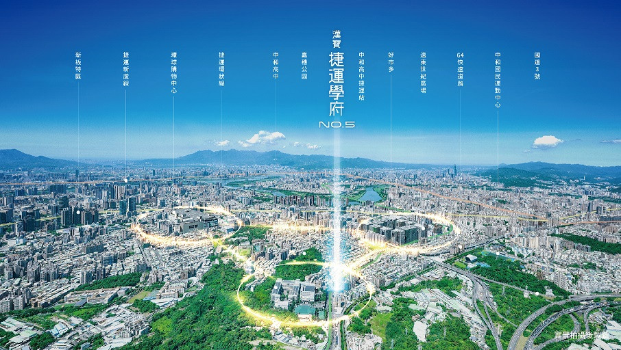 「漢寶捷運學府NO.5」所在的萬大線中和高中站LG08站,通車後7站直達中正紀念堂站,快速轉乘淡水信義線、松山新店線到台北市心各大商圈、9站達台北雙星銜接機捷國門。3分鐘上北二高中和交流道,6分鐘進入台64線匝道的交通優勢,就近享有連城路、員山路機能成熟的商業街廓、遠東世紀廣場科技聚落、環球購物中心、威力廣場、中和好市多等完善購物機能,同時擁有從幼兒園到高中的完整學區機能。