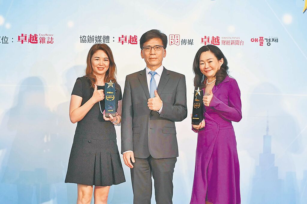 花旗(台灣)蟬聯卓越雜誌兩項大獎。左起為花旗(台灣)發言人潘玲嬌、金管會主委彭金隆及花旗(台灣)商業金融事業群負責人余苑菱。(花旗提供)