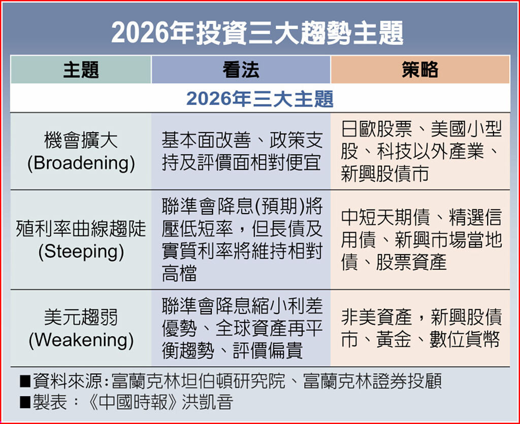 富蘭克林坦伯頓基金集團也預測,明年美元將趨弱(Weakening),策略上建議納入非美資產,尤其看好新興市場、黃金及數位資產。(中國時報)