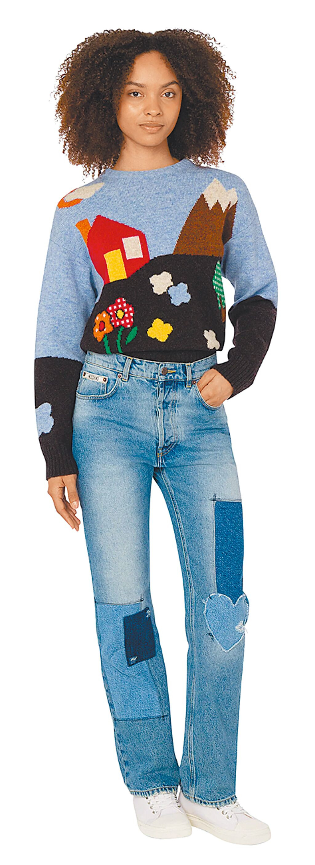 SOGO敦化館MOSCHINO童趣印花針織毛衣,2萬6800元、丹寧補釘拼接牛仔褲3萬2800元。(SOGO提供)
