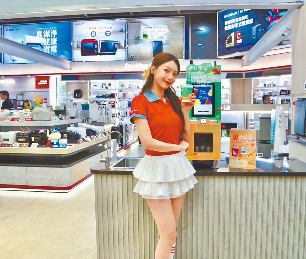 李雅英擔任「來店50」一日店長,宣傳全國電子高雄民族店多項優惠,即日起至12月8日消費滿1000元還可現場兌換「果然好喝」現打果昔。(全國電子提供)