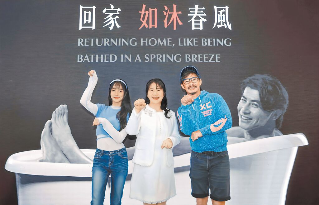 東湧董事長吳和臻(中)親自發表最新節能系統,藍波老師(右)與女兒潔潔也現身實證熱水器效能,並熱跳「馬年加碼溫暖舞」應援。(陳俊吉攝)