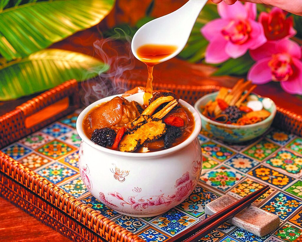 「巴生肉骨茶」精華湯包嚴選豬肋排與漢方慢火細燉,以溫厚辛香與胡椒芬芳巧妙平衡美粽的豐腴油脂。(台北遠東香格里拉提供)