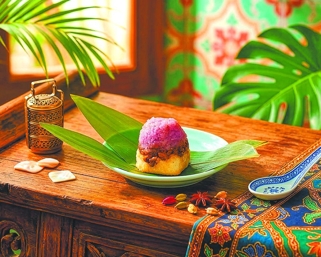 今年飯店多款充滿亮點的粽品中,首推行政主廚陳勇偉親自操刀設計的「檳城道地南洋粽」,主廚以紫心甘薯粉染製粉紫外衣,糯米與香蘭葉一同蒸製增香,再拌入椰奶,內餡以豬肩肉、南薑、芫荽籽與冬瓜糖堆疊南洋風味,微甜清香、層次鮮明,完美復刻大馬街頭最道地的午后時光。