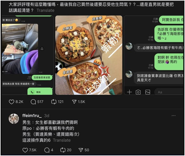 男友看不懂「必勝ㄎ瞎子跟牛肉片」口味披薩?女友氣炸Po文閨蜜秒懂!