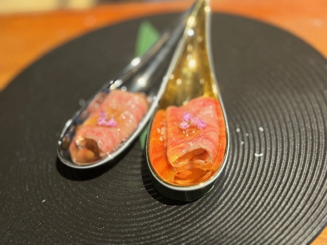 此外,海鮮料理如C鹽烤紋甲烏賊」、「北海道海膽手捲」等,也以直火炙烤或生食方式呈現海洋風味。湯品部分則有蔬菜高湯為基底的「牛肉清湯」、搭配富山灣白蝦與柚香的「柚雪味噌湯」等,展現出對細節的高度講究。