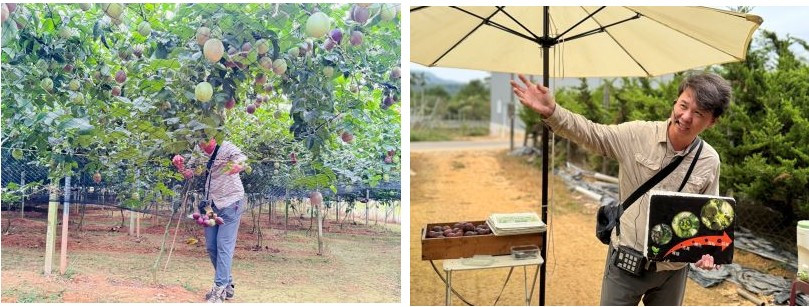 在桃米休閒農業區,體驗百香果農事活動,於棚架下撿拾自然落果,並聆聽農友分享產季管理與友善耕作的實務經驗。透過「實際下田」的過程,旅客不僅帶回當季農產,也更直觀理解永續農業如何在土地中落實。