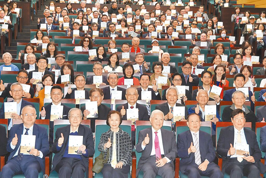永豐餘學院院長何壽川(前排右三)29日舉行《循環在有無之間》新書發表會,除信誼基金會董事長張杏如(前排左三)及家人外,肝病防治學術基金會董事長許金川(前排右二)等各界好友也到場支持。(鄧博仁攝)