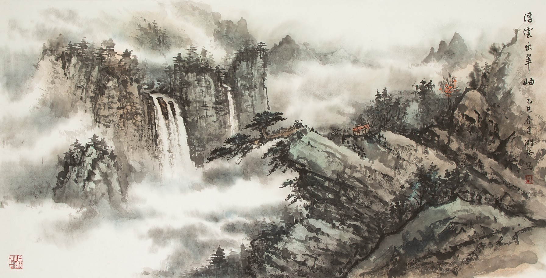 黃湘詅|《浮雲出翠岫》群峰層疊、飛瀑隱現於雲霧之間,筆墨蒼潤而氣韻流動,展現山林清遠與東方水墨的空靈境界。(圖片提供/白雲堂藝術研究會)