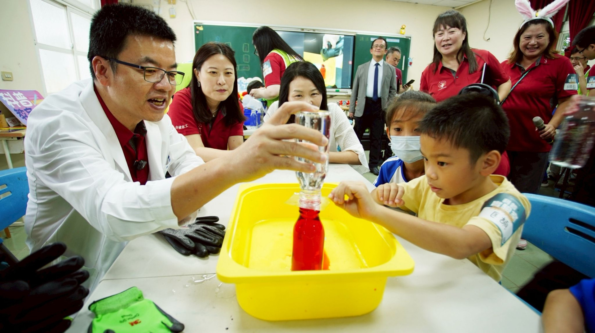 圖/台積電先進封裝技術暨服務副總經理何軍與小朋友一起做科普實驗。(台積電慈善基金會 提供)