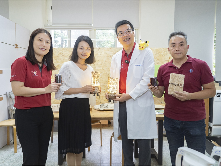 圖/三灣國小校長陳美君(左二)將學生手作木工贈與台積電先進封裝技術暨服務副總經理何軍,感謝台積電對學校的協助。(台積電慈善基金會 提供)