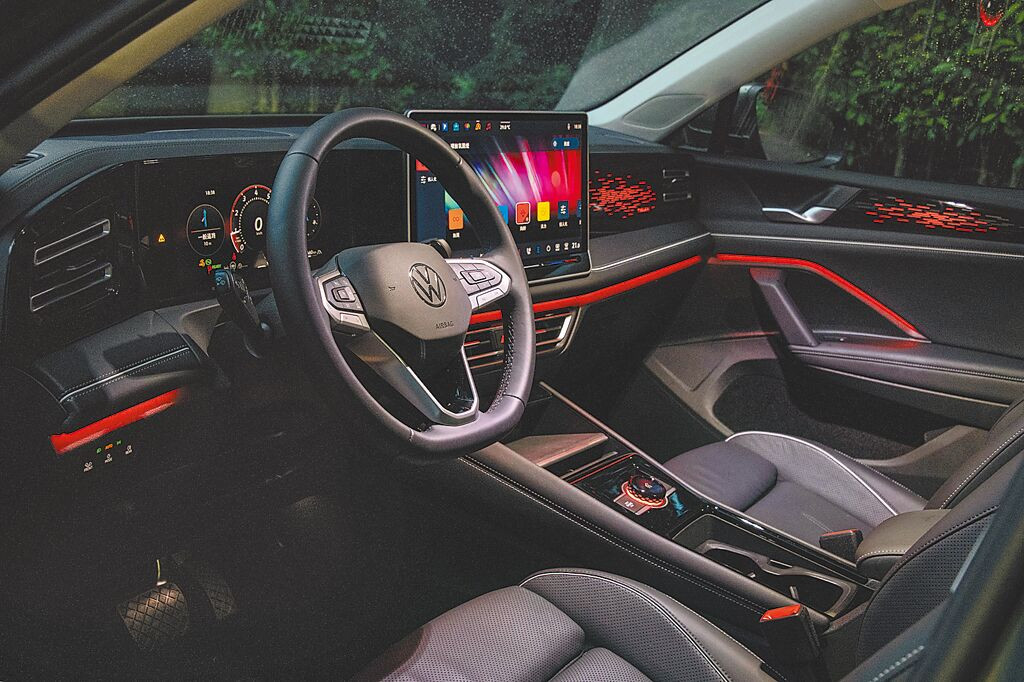 藉由不同色彩、亮度的車室氛圍燈營造出不同的氛圍感受,圖為預設的「熱情」模式。(陳大任攝)