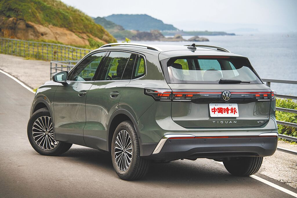 全新Tiguan 280 eTSI Elegance Premium為車系最熱銷的主流車款,車頭採用與車身同色前保桿,並搭配橫柵式鍍鉻飾條及LED貫穿式定位燈,其他包括18吋Napoli鋁圈、炫銀車頂行李架,予人優雅內歛又不失運動感的視覺效果。(陳大任攝)