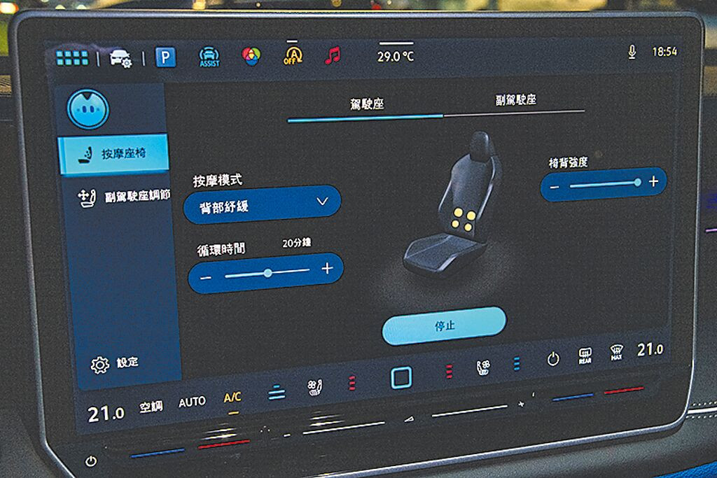 雙前座椅具備氣動式按摩及通風加熱功能,可於中央螢幕設定。(陳大任攝)