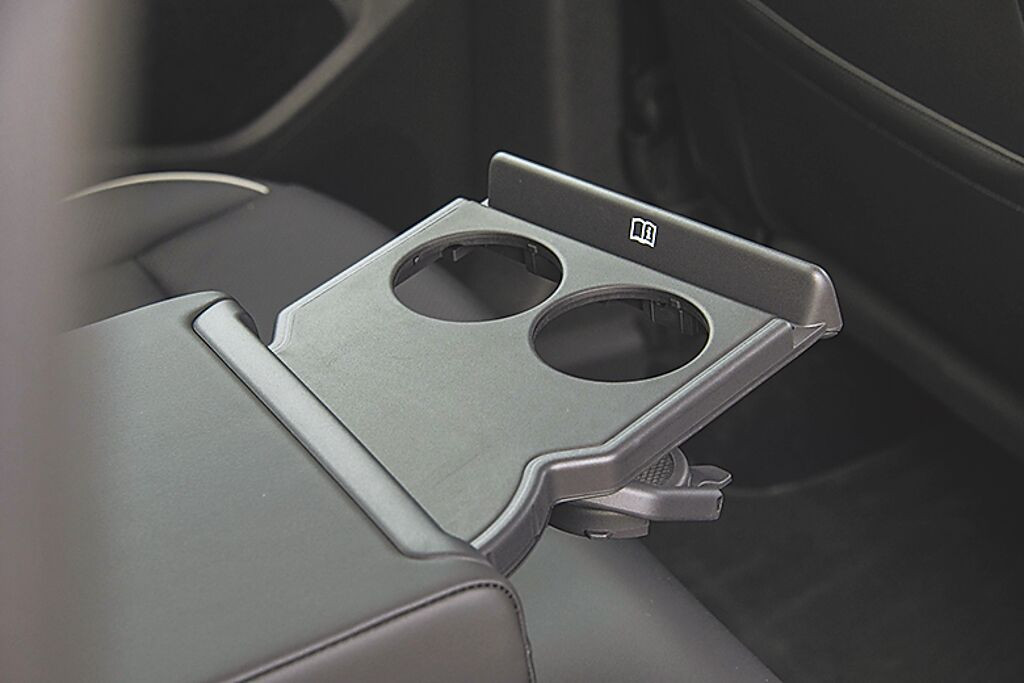 拉出中央扶手置杯架後可向左、向右轉角,並附加可供手機/平板的支架。(陳大任攝)