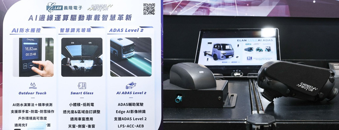 在「先進車用科技主題館」,可以看到 AI 已經成為交通安全的隱形守護者。義隆電子展示ADAS先進駕駛輔助系統就是代表案例,其長期專注於Edge AI影像辨識技術,結合自研的觸控IC與 AI感測晶片,具備「晶片到整車」的整合能力,應用於智慧座艙與人機互動,車用解決方案不僅廣泛被導入高階車用面板與ADAS系統,也參與全台首輛Level 3自駕電巴計畫合作。