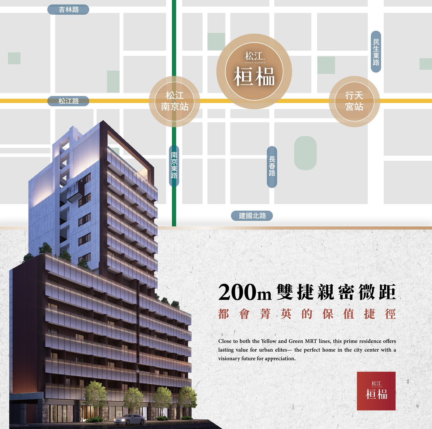 《松江.桓榀》基地位於南京松江商圈,距離捷運松江南京站8號出口僅200公尺,為雙捷交會的、交通節點核心,串聯金融、科技與總部級辦公聚落,特別是該案正位於南京東路至民生東路之間約600米最精華的松江路段,頂級商辦大樓林立,商業氣氛濃厚,土地價值高昂,但也顯得住宅產品尤為珍稀。