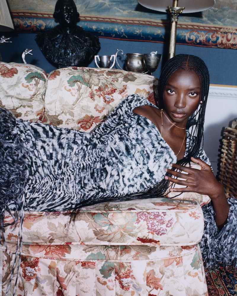工藝細節為晚裝增添浪漫氣息:天鵝絨嵌花洋裝與層疊輪廓,以及手工剪裁的印花尼龍縐綢於裙襬呈現流蘇效果。