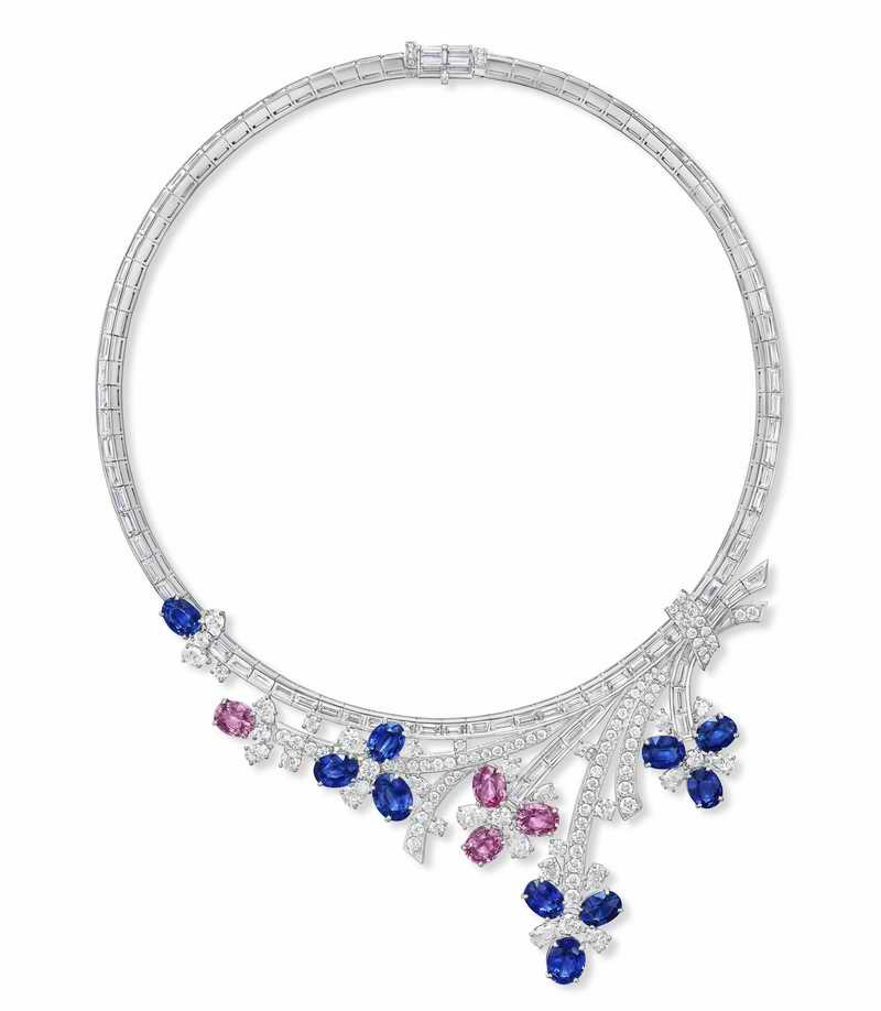 海瑞溫斯頓頂級珠寶系列藍寶石、粉紅藍寶石及鑽石項鍊鑲嵌14顆總重約35.54克拉來自斯里蘭卡的橢圓形切工藍寶石及粉紅藍寶石;綴以235顆總重約37.11克拉的圓形明亮式、長型及水滴型切工鑽石,悉心鑲嵌於鉑金底座。