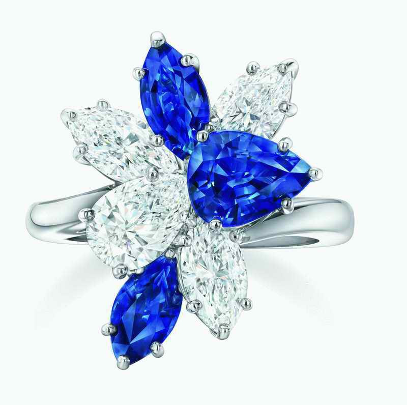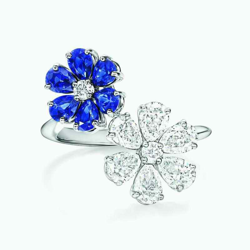 海瑞溫斯頓 勿忘我Forget-Me-Not 系列藍寶石鑽石雙環戒指交錯採用6顆水滴型切工藍寶石,總重約1.26克拉,搭配8顆總重約1.17克拉的水滴型切工鑽石和圓形明亮式切工鑽石。璀璨的兩朵現代風格的寶石花朵相依,在幾近隱形的鉑金底座上綻放純粹光芒,向大自然的永恆華美致敬。