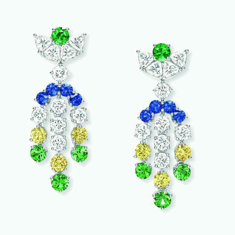 New York系列Manhattan Adornment耳環以2顆圓形明亮式切工祖母綠、6顆圓形明亮式切工沙弗萊石、6顆圓形明亮式切工黃鑽,搭配8顆圓形明亮式切工藍寶石和20顆圓形明亮式與三角形切工的鑽石,悉心鑲嵌於鉑金底座。