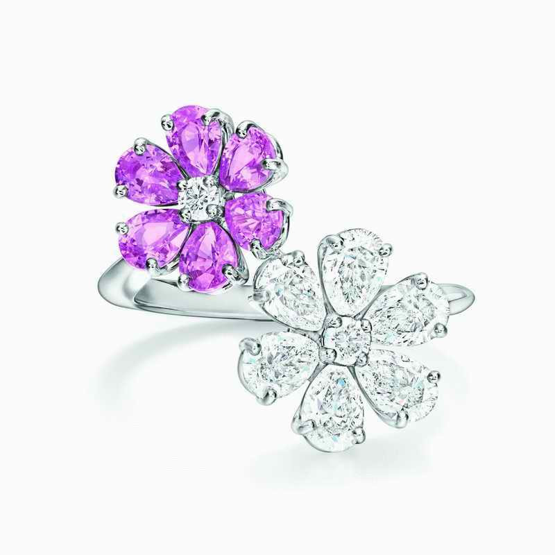 海瑞溫斯頓勿忘我Forget-Me-Not 系列珠寶讚頌勿忘我的優雅花姿,以璀璨寶石將大自然之美化作雋永的作品,為配戴者增添與衆不同的柔情與光彩。勿忘我Forget-Me-Not系列 粉紅藍寶石鑽石雙環戒指交錯採用6顆總重約1.26克拉的水滴型切工粉紅藍寶石,與一朵鑽石花卉,悉心鑲嵌於鉑金底座。
