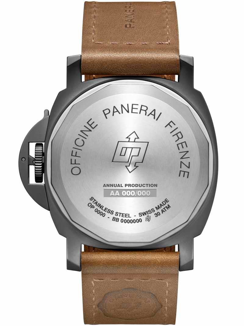 錶盤鐫刻「Marina Militare」(義大利海軍)的字樣,時標與字母的字型也經過重新設計,精準復刻 1993 年錶款的原始風貌。不同於沛納海標誌性的三明治錶盤,PAM05218 採用單層鏤空的錶盤結構,細節鐫刻後塗覆 Super-LumiNova® 夜光塗層,並融入凹弧設計,視覺上提升時標的立體感。除此之外,此款新作也重現 1993 年當代錶款最具代表性的視覺特徵 — 錶盤與指針的撞色搭配,PAM05218 採用單層雕刻黑色霧面錶盤,搭配焦糖色 Super-LumiNova® 夜光塗層與色調更淺的指針,精心還原沛納海首批民用腕錶的細節巧思。錶背採用旋入式精鋼底蓋並完美復刻原創腕錶上的 Officine Panerai Firenze 的字樣、充滿歷史意義的 OP 標誌與錶款細節,防水深度高達 300 米。