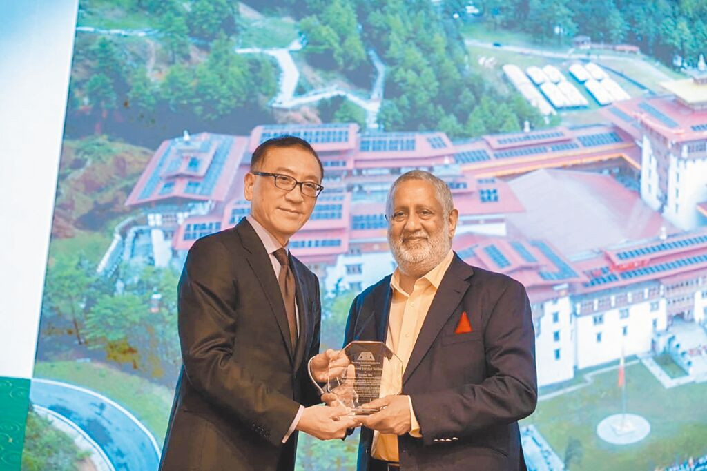 為感謝中國信託金控副董事長吳一揆(左)擔任ABA會長期間的努力及卓越貢獻,ABA榮譽會長Mr. Rajendra Theagarajah(右)特別致贈感謝獎座。(ABA提供/黃琮淵台北傳真)