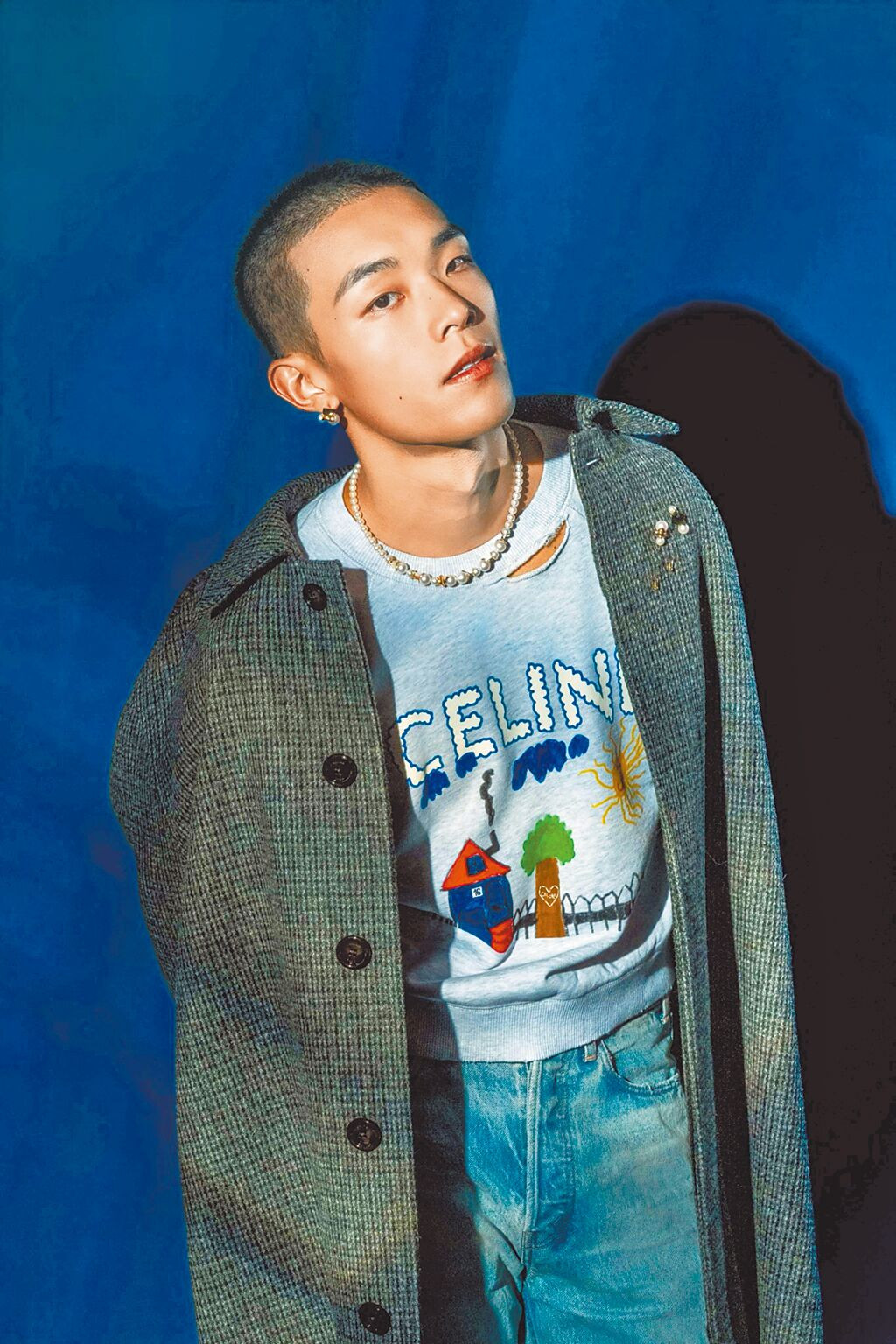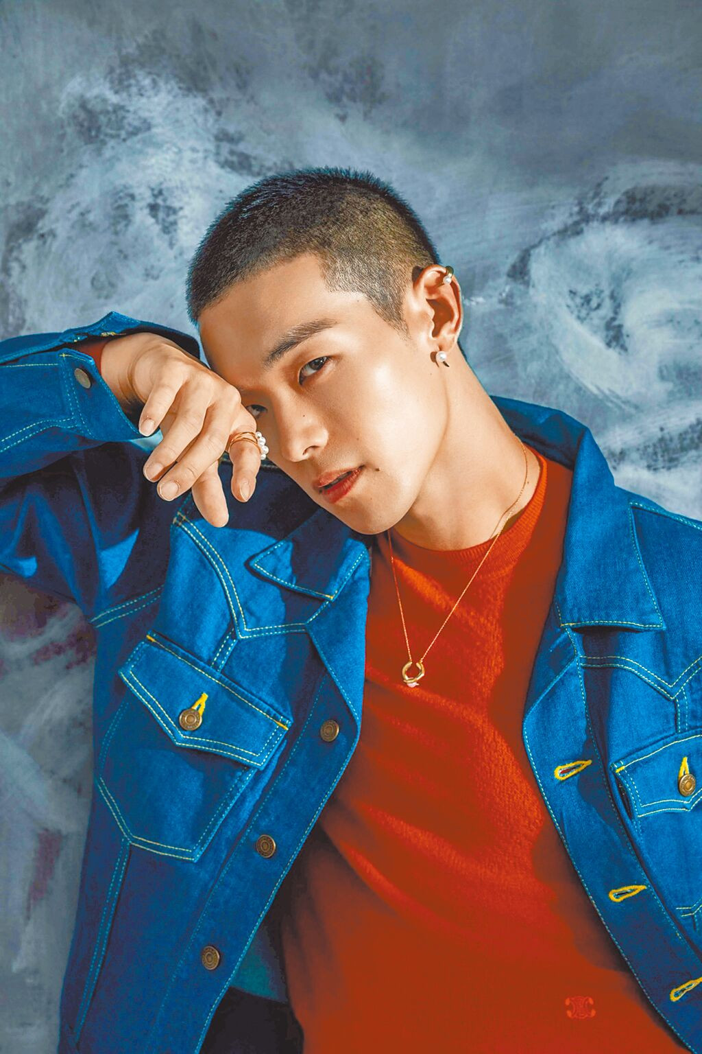 牧森進棚拍攝TASAKI珠寶專題,珍珠的柔媚優雅融入鉚釘金屬元素,充滿龐克叛逆時尚。(攝影/石智中‧服裝提供/celine)