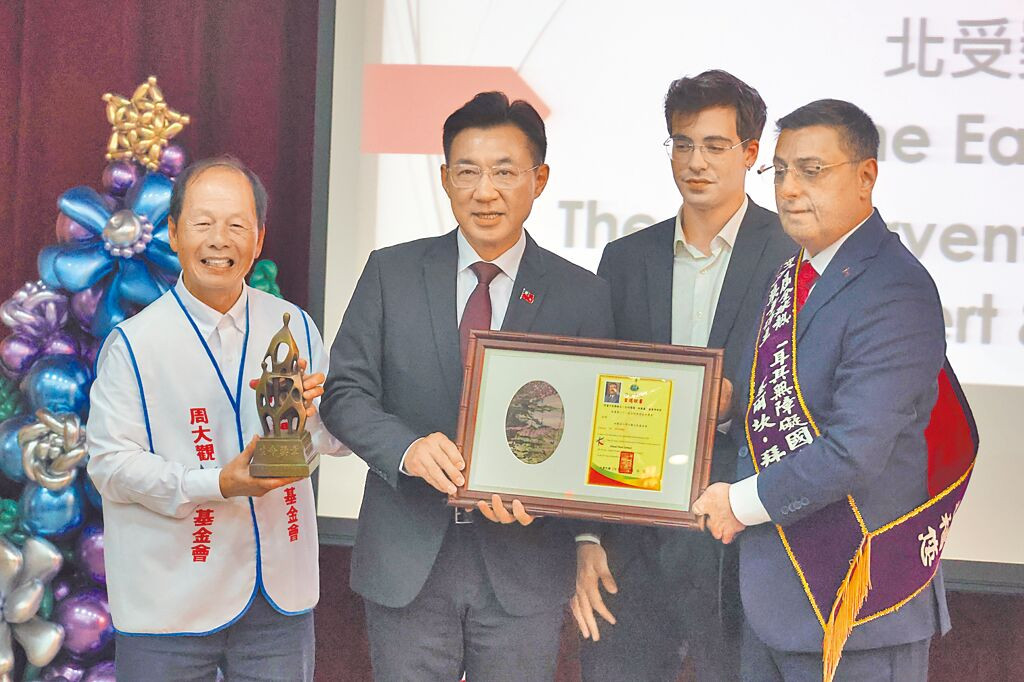 土耳其身心障礙議員塞爾坎‧拜拉姆(右)獲頒熱愛生命獎章。 (周大觀文教基金會提供/林良齊台北傳真)