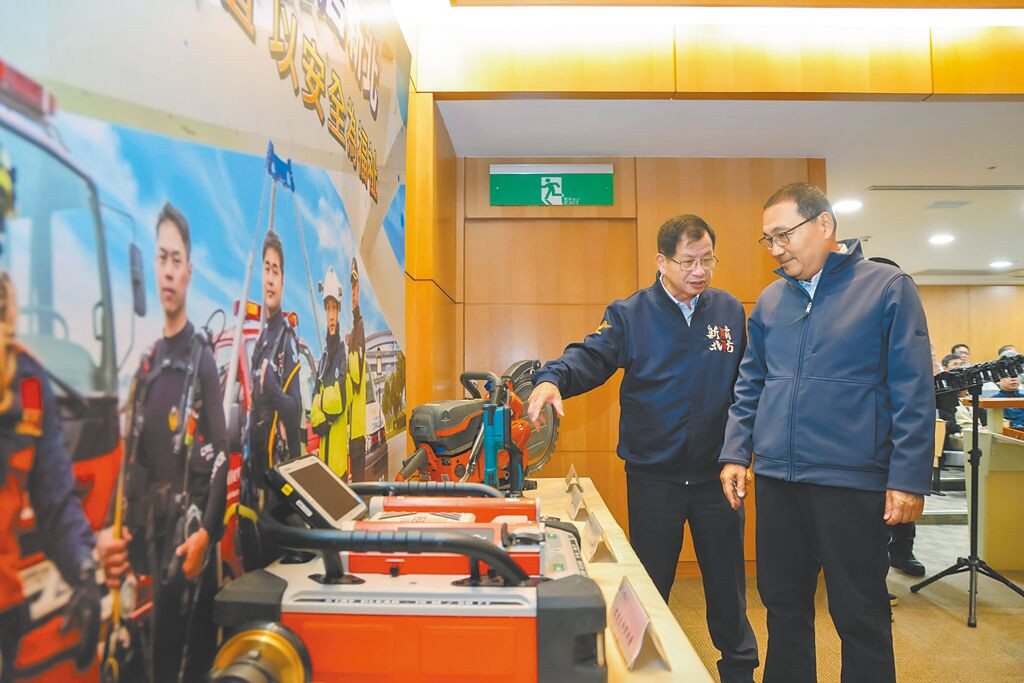 新北市消防局長陳崇岳(左)向市長侯友宜(右)介紹特搜大隊各項先進裝備。(王揚傑攝)
