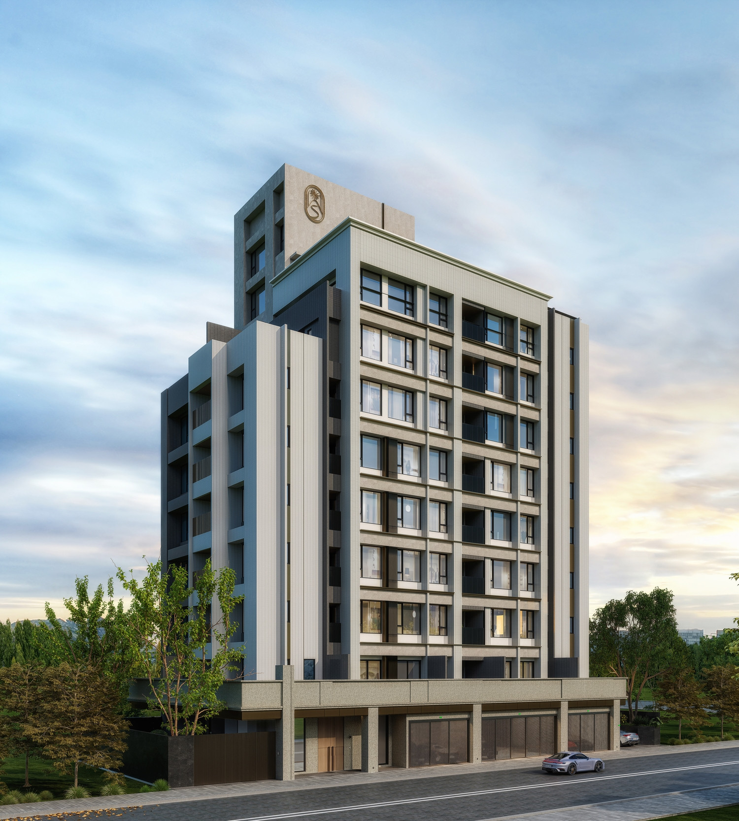 「昀集富昱」 建築外觀3D透視參考示意圖。(周遭環境系電腦合成,建設公司保有建物外觀修正之權利)