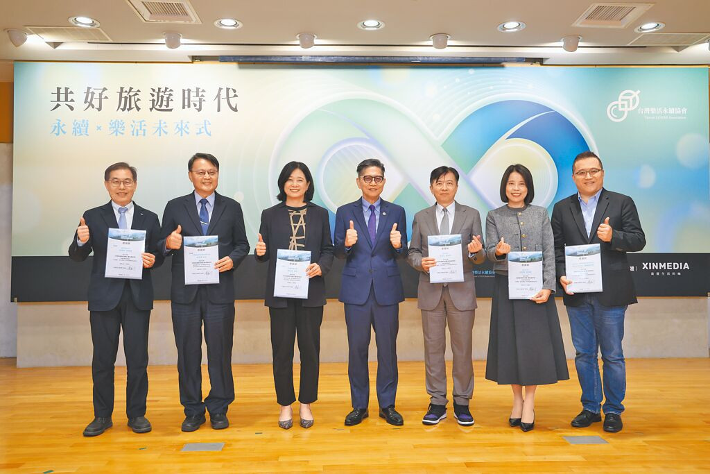 國營臺灣鐵路公司總經理馮輝昇(左起)、環境部政務次長謝燕儒、交通部觀光署長陳玉秀、台灣永續樂活理事長黃信川、雲品國際酒店集團董事長盛治仁、台灣Visa總經理黃慧琴、Amadeus大中華及蒙古區旅遊分銷高級副總裁Brian Chien特別出席活動。(台灣樂活永續協會提供)