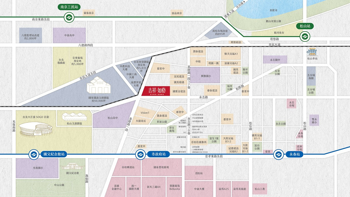 值得一提的是,市府站生活圈不僅與信義計畫區為鄰,左側相接的南松山都市計畫,開發量體上看2600億元,是目前台北市中心最大規模的開發計畫,規模直接比肩西區雙子星與北士科。這項計畫串聯忠孝東路、南京東路、光復北路與基隆路一段區域,包含京華城改建、台泥智慧園區、大巨蛋、松菸文創園區,以及將於 2027 全面開館的亞洲最大鐵道文創園區,規劃拓寬人行道路廊構築市中心罕見的文化、商辦、藝文與休憩的複合城市帶。都市發展專家分析,南松山將補足信義計畫區少有的「文化休閒含量」,一旦完整成型,將打造出比現今信義更大的國際級生活與經濟板塊,以市府站為中心的生活圈,將是最直接受惠的第一排。