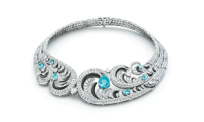 寶格麗Bird of Paradise天堂鳥頂級鑽石與帕拉伊巴碧璽彩寶項鍊。(BVLGARI提供)