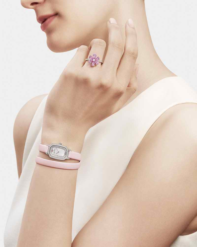 本次精選三款印記 Emerald 系列雙圈緞面錶帶款式,為七夕造型注入甜美光芒:紅色款風格華麗搶眼,以白色珍珠母貝錶盤點綴四顆絕美紅寶石,象徵愛意的熾熱濃烈;粉色款柔美溫婉,散發細膩少女氣息,與勿忘我 Forget-Me-Not 系列粉紅藍寶石戒指相互輝映,是戀人間悄然契合的詩意象徵;而夢幻的糖果粉色款則以虹彩粉色珍珠母貝錶盤,搭配大小不一的蛋面珍珠母貝與 20 顆圓鑽,幻化為錶盤内圈的閃耀氣泡,錶盤上 12 點鐘位置飾以祖母綠型品牌標誌,如愛情裡怦然心動的悸動時刻。
